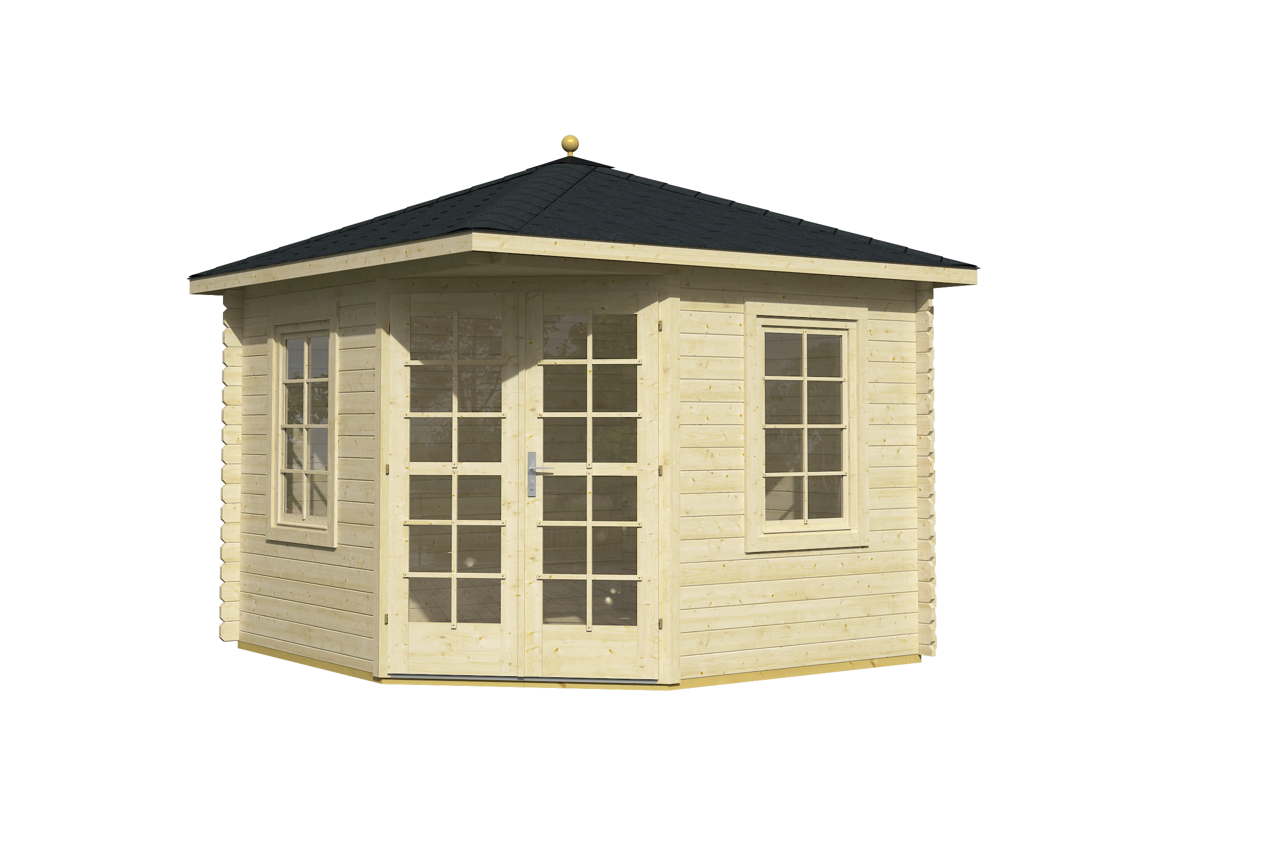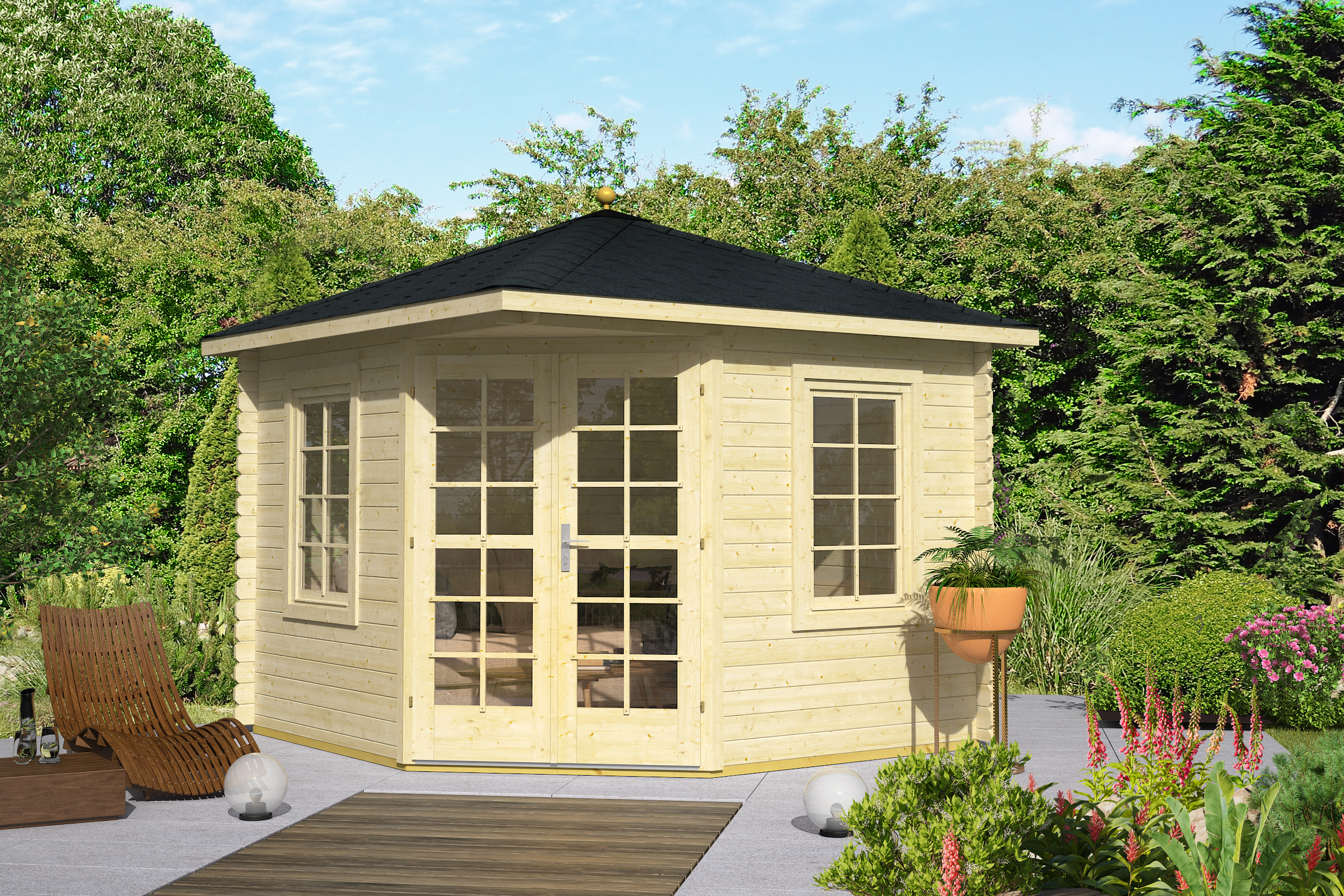 Enthalten sind eine Doppeltür und Fenster aus Brettschichtholz mit verglaster Einheit, eine Edelstahlschwelle, der Boden, imprägnierte Fundamentbalken, Befestigungselemente und eine Montageanleitung.