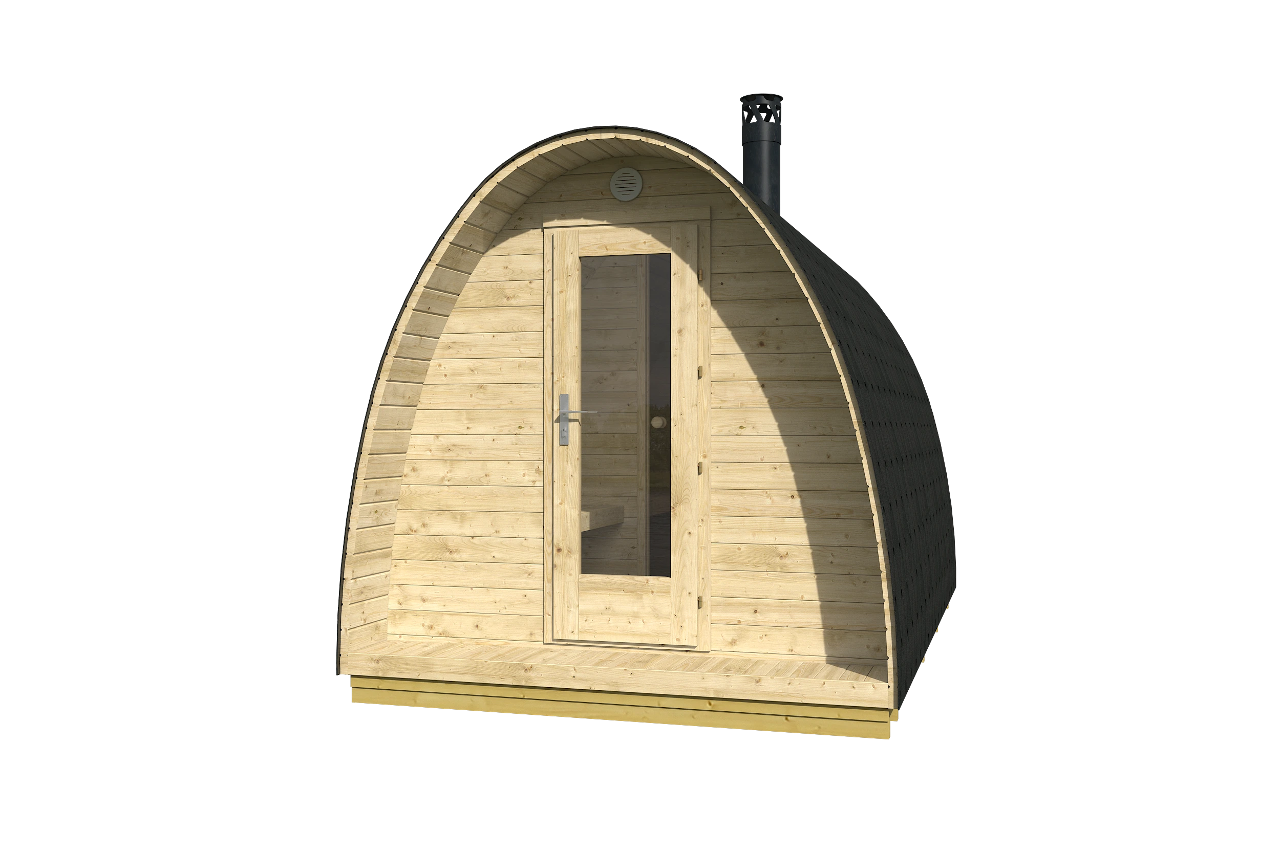 Prefabricated sauna pod Kris, roof finished with black honeycomb shingles, wood-fired heater with stones (100 kg), high-quality chimney with a damper and water tank. External surface is finished with Teknos AQUAPRIMER stain TM 1824.