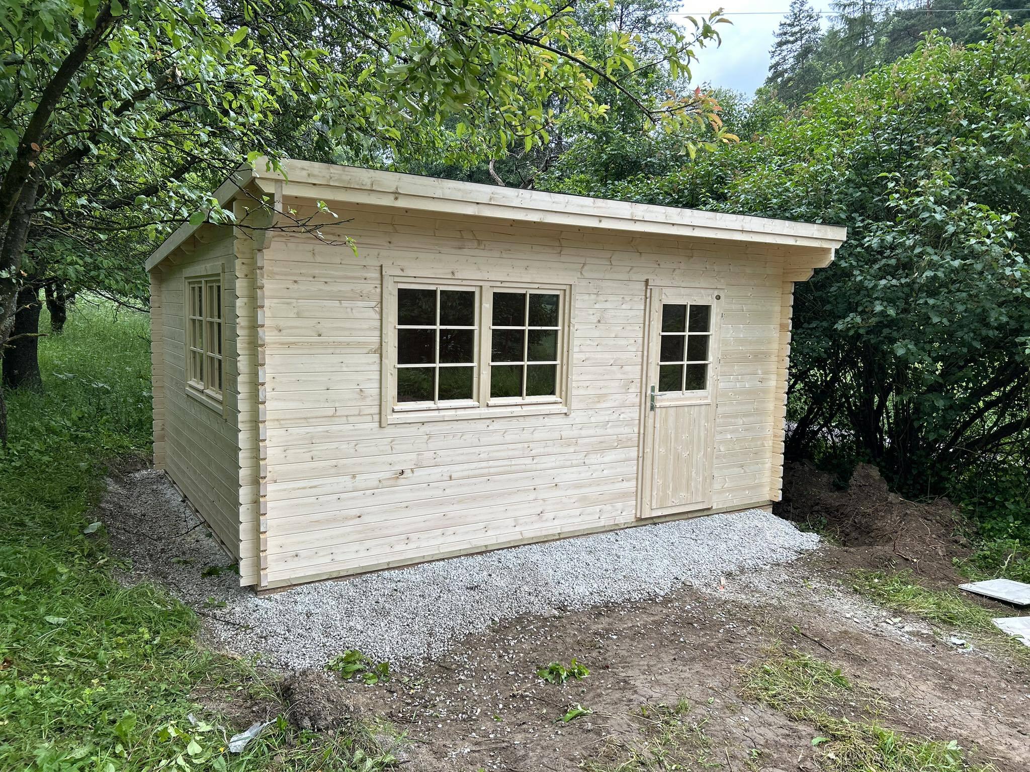 Le prix inclut une porte et des fenêtres vitrées en bois lamellé-collé, un seuil de porte en acier inoxydable, le plancher, des solives imprégnées, les fixations et les instructions de montage. Le prix n’inclut pas les matériaux de toiture et le transport.
