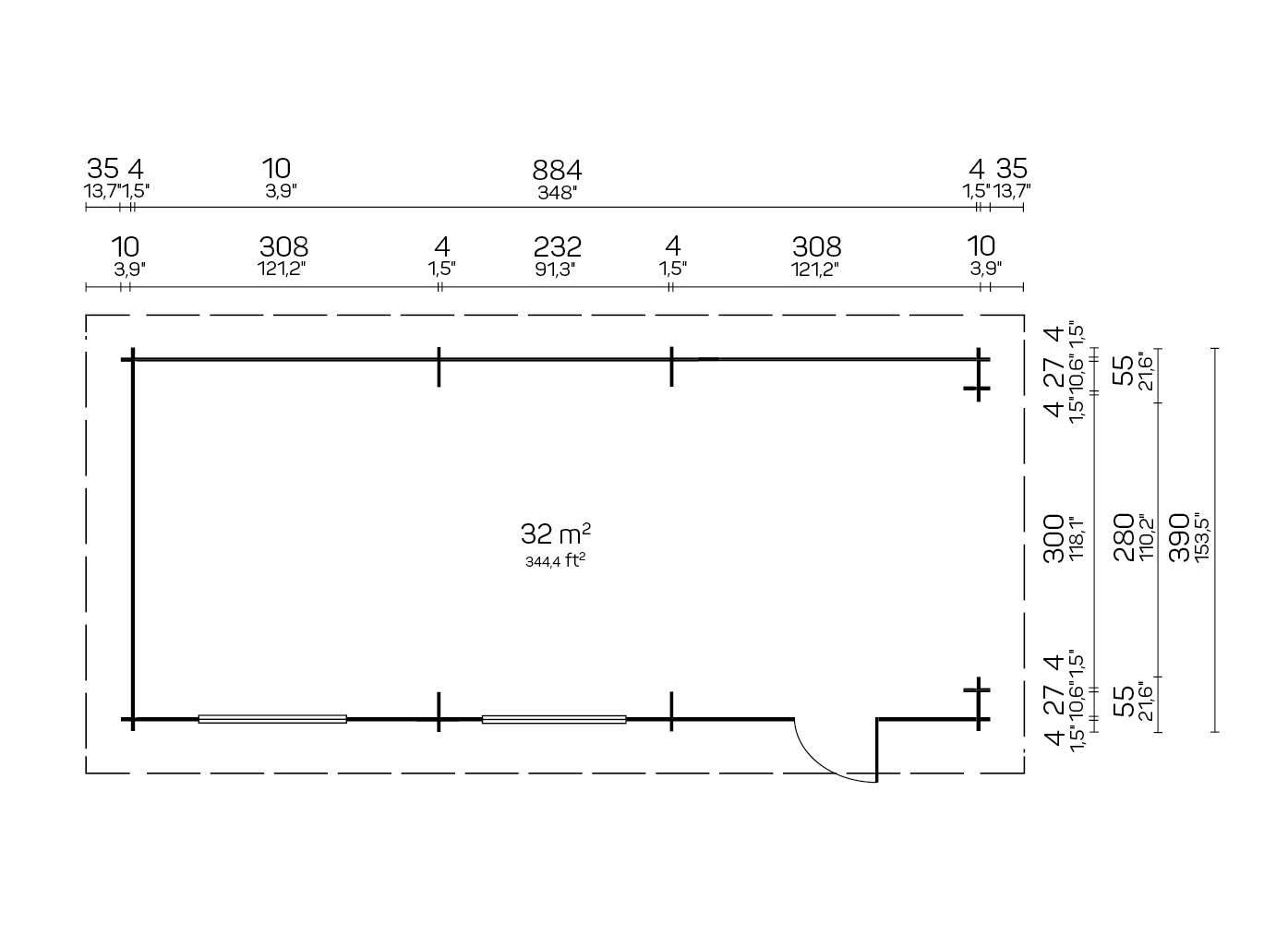 Le prix comprend la porte en bois lamellé-collé avec paquet de verre et la fenêtre avec paquet de verre, les ressorts de fondation imprégnés, les accessoires de fixation et les instructions de montage. Le prix ne comprend pas le transport et le matériel de couverture.