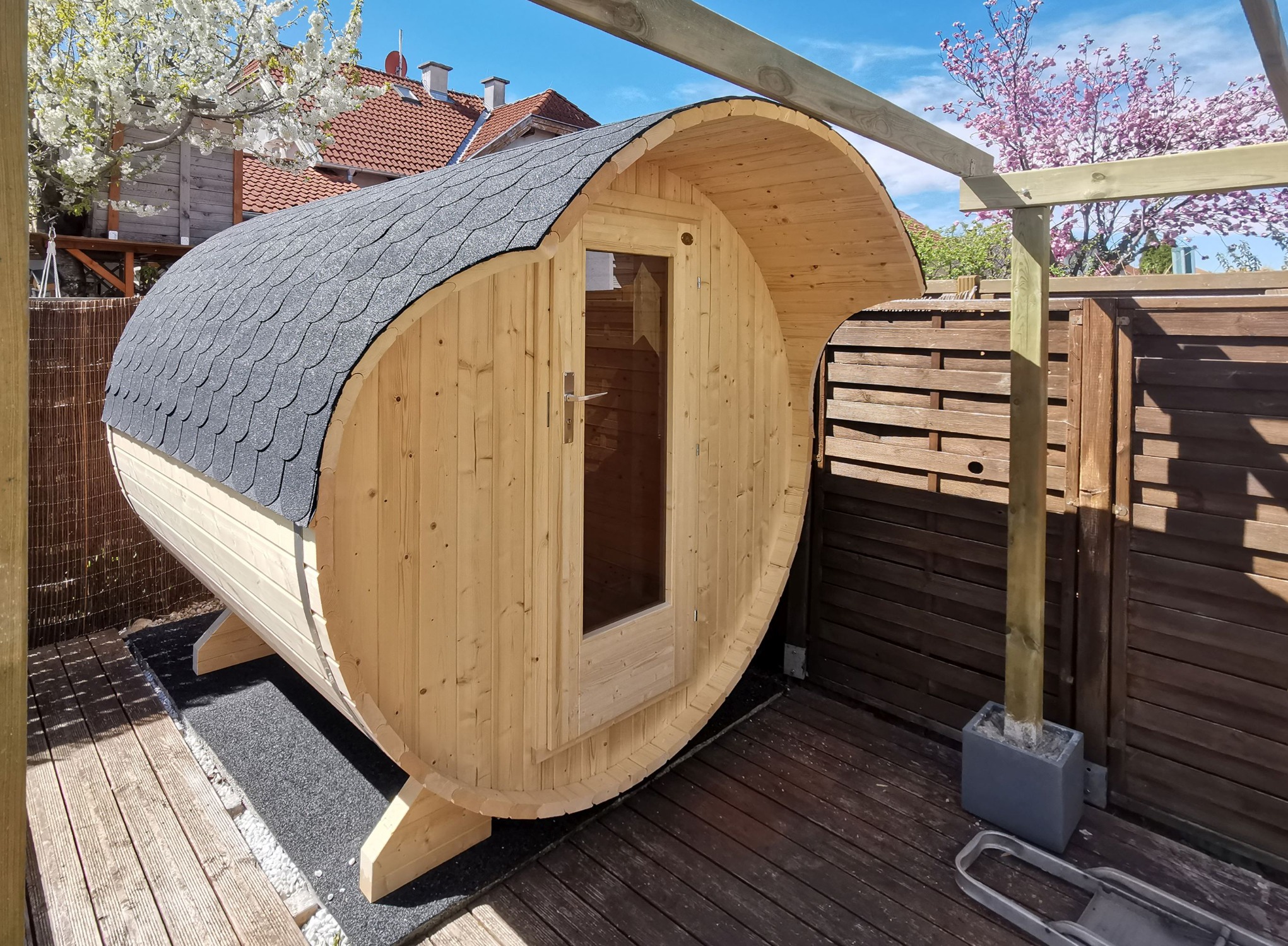 Sauna tonneau préfabriqué Masku, toit avec bardeaux noirs en nid d’abeille, poêle à bois avec pierres (100 kg), cheminée de haute qualité avec registre et réservoir d’eau. La surface extérieure est finie avec la lasure teknos AQUAPRIMER TM 1824.