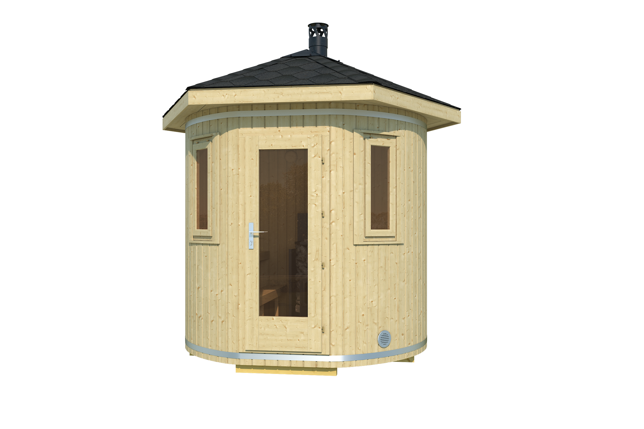 Valmis ehitatud püstine tünnisaun Tornio, Ø 240cm, katusekatteks must kärgruberoid, puuküttega keris koos kividega (80kg), kvaliteetne siibri- ja veepaagiga korsten.