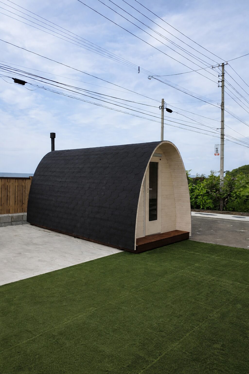 Prefabrykowana sauna igloo Lars, z dachem wykończonym czarnymi gontami o kształcie plastra miodu, obróbkami okapów i krawędzi, piecem opalanym drewnem z kamieniami (100 kg), kominem wysokiej jakości z przepustnicą i zbiornikiem na wodę. Zewnętrzna powierzchnia została wykończona środkiem Teknos AQUAPRIMER stain TM 1824.