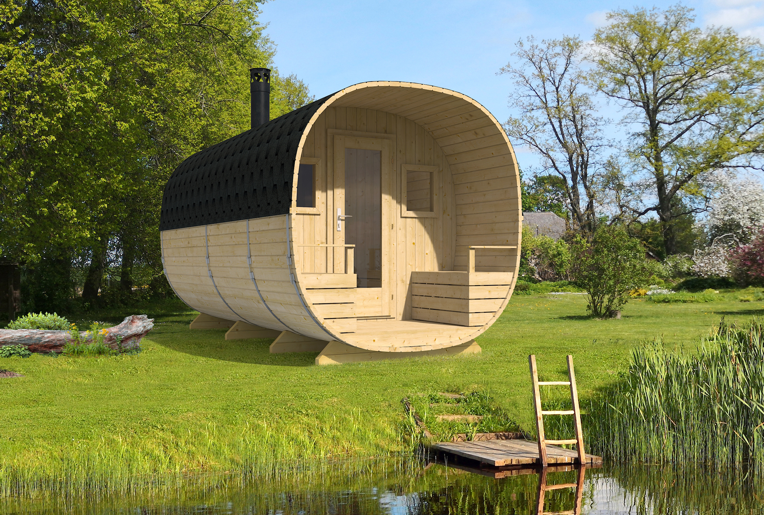 Prefabrykowana sauna beczka Turku, z dachem wykończonym czarnymi gontami o kształcie plastra miodu, piecem opalanym drewnem z kamieniami (100 kg), kominem wysokiej jakości z przepustnicą i zbiornikiem na wodę. Zewnętrzna powierzchnia została wykończona środkiem Teknos AQUAPRIMER stain TM 1824.