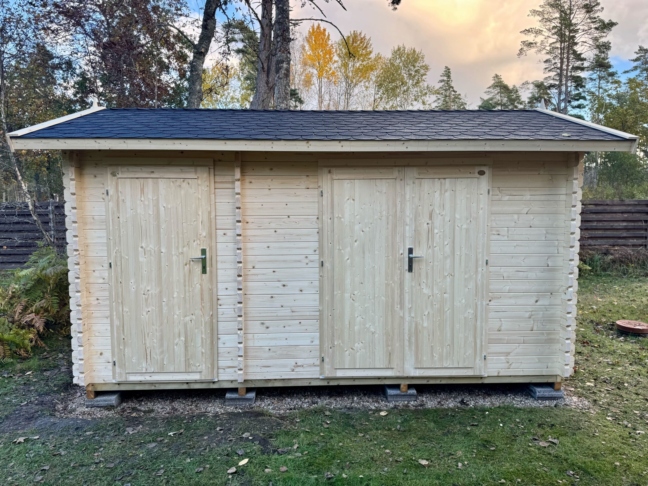 Hinnas laudisega liimpuidust uksed, klaaspaketiga aknad, roostevabast plekist lävepakk, 28 mm põrand, immutatud vundamendiprussid, kinnitusvahendid ja paigaldusjuhend.